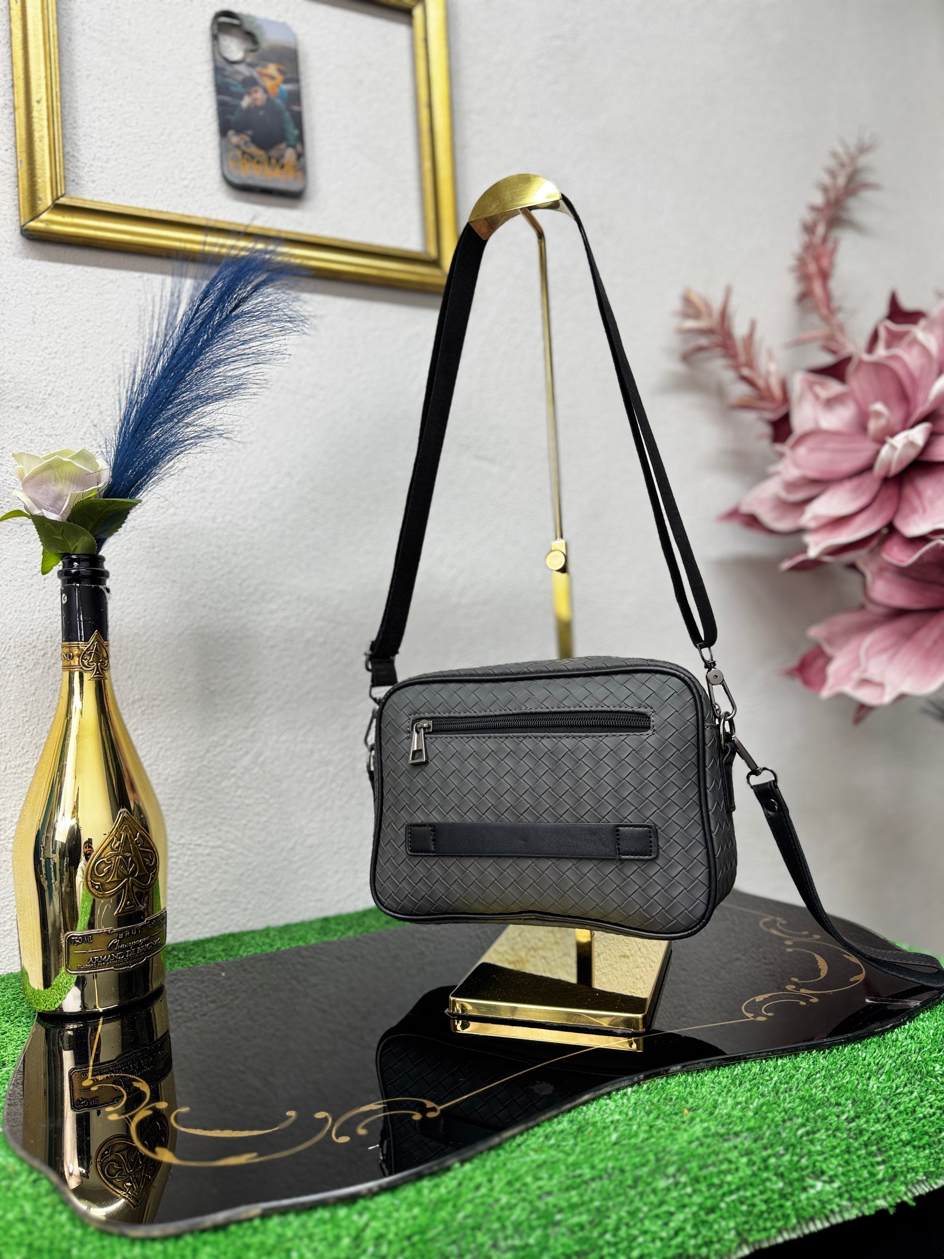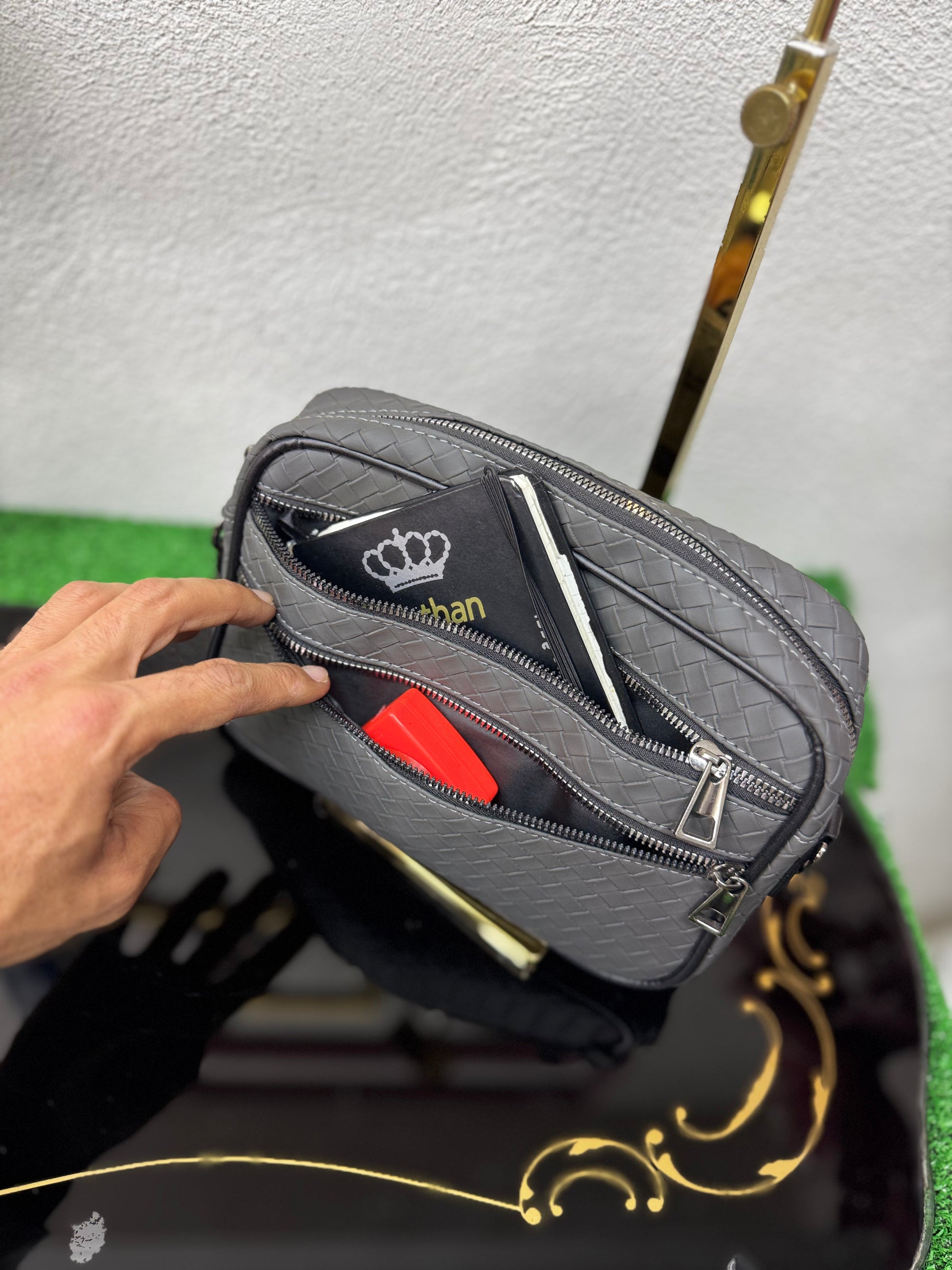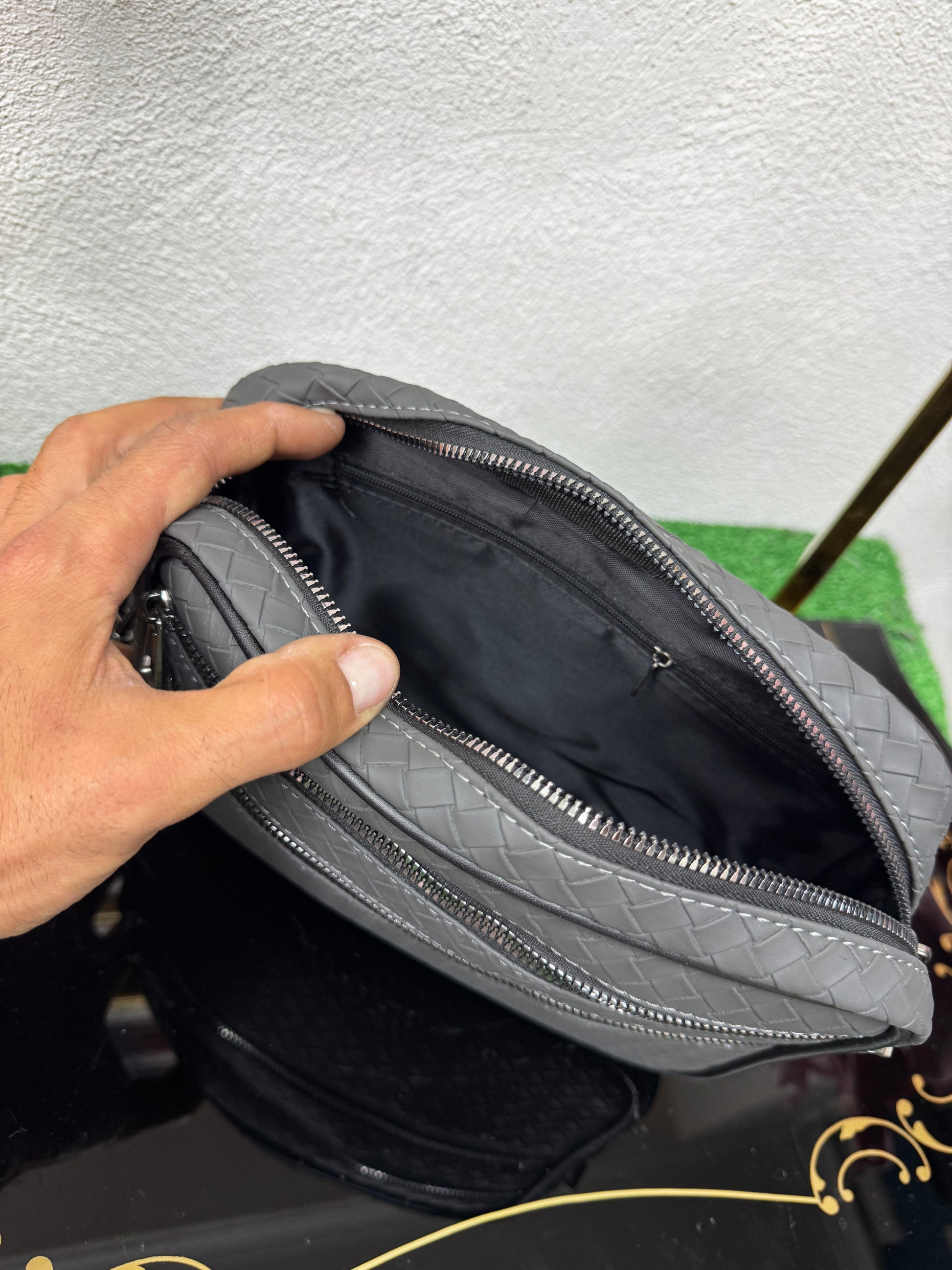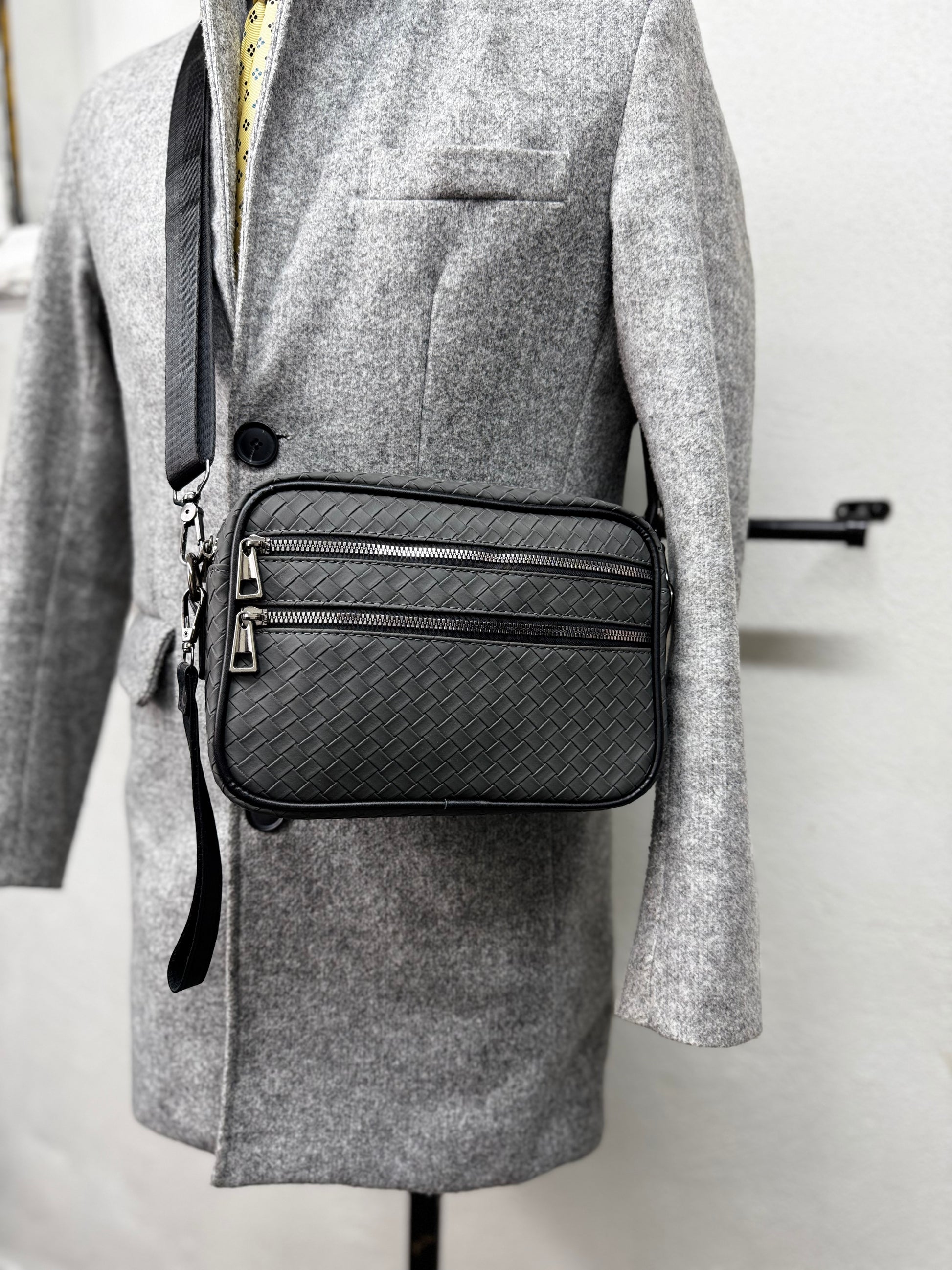 Realizzata in ecopelle lavorata con trama intrecciata, presenta una struttura solida ma leggera, ideale per l’uso urbano e professionale. Il design pulito è arricchito da doppia tasca frontale con chiusura a zip, che consente di organizzare in modo ordinato smartphone, portafoglio, chiavi e piccoli oggetti essenziali.