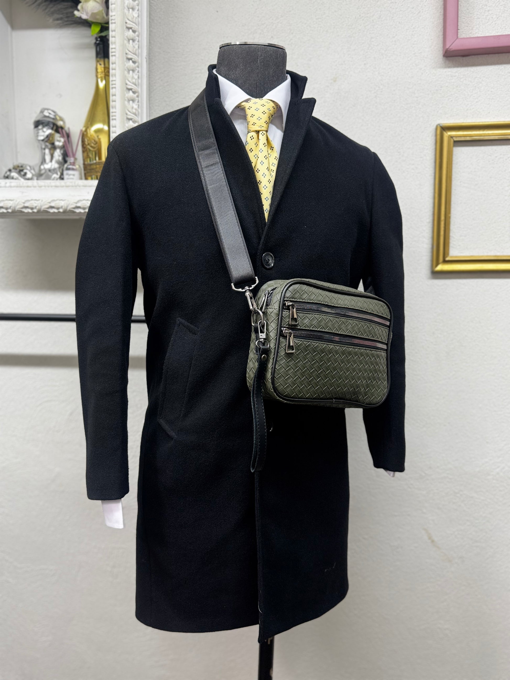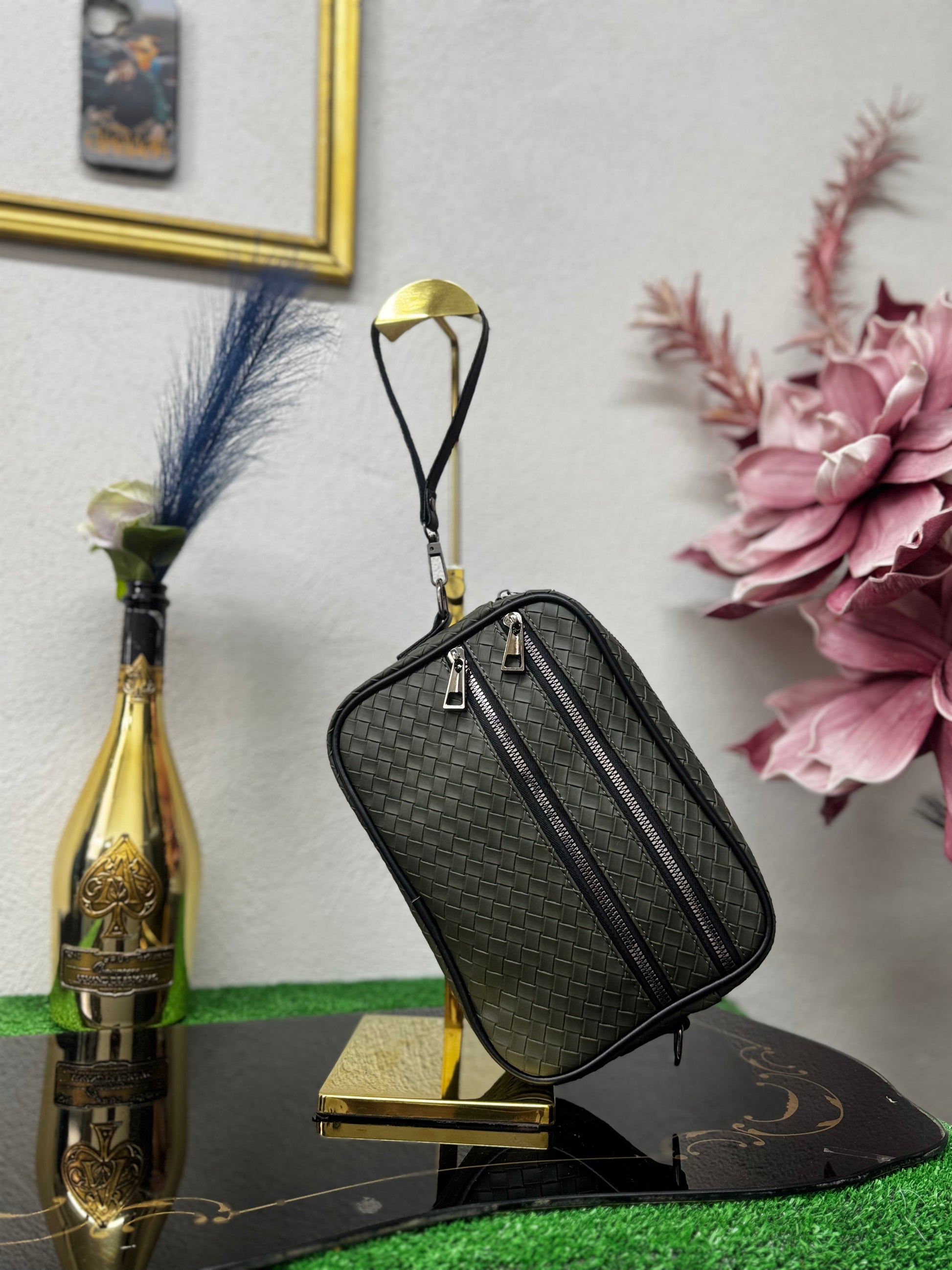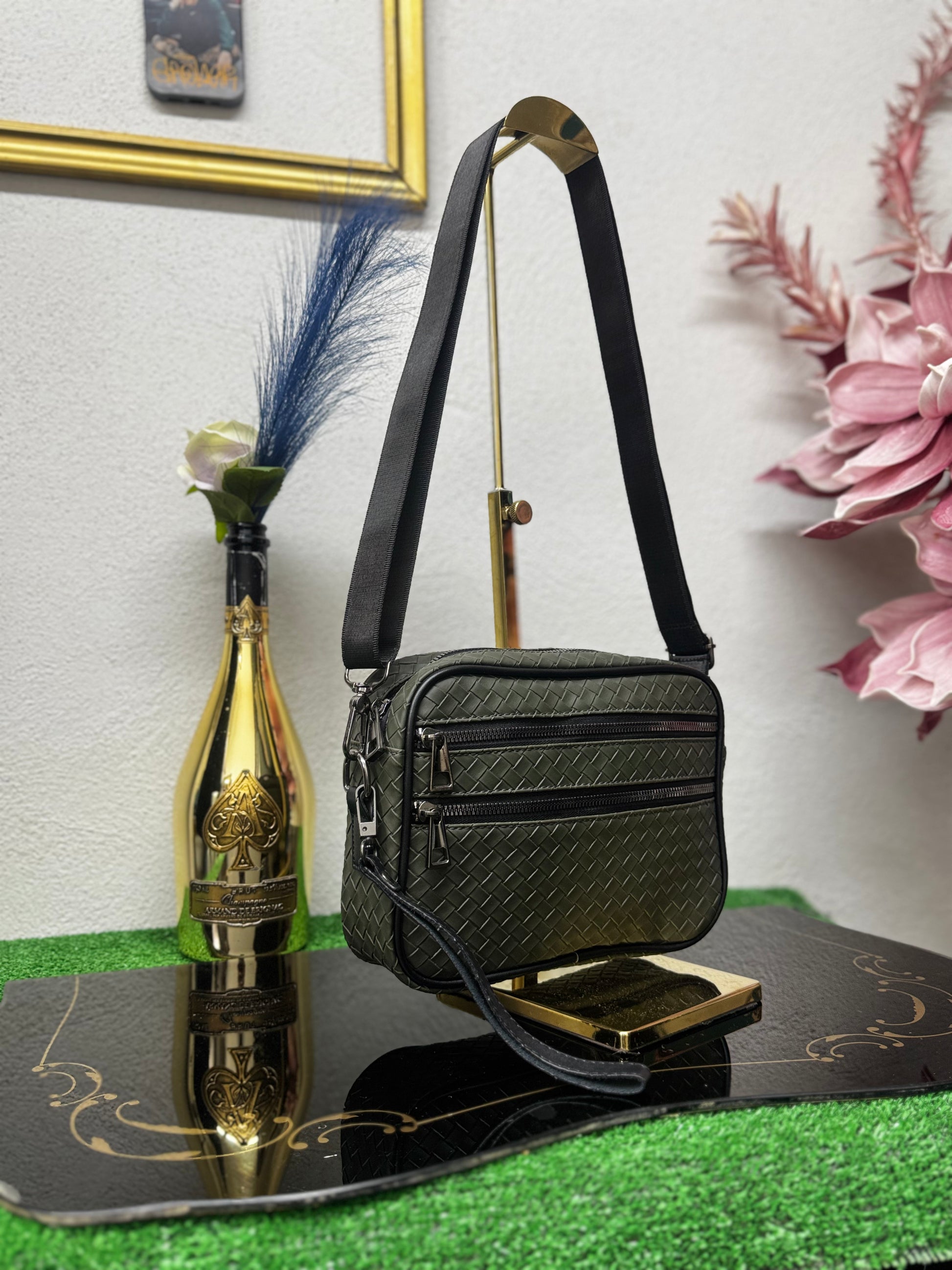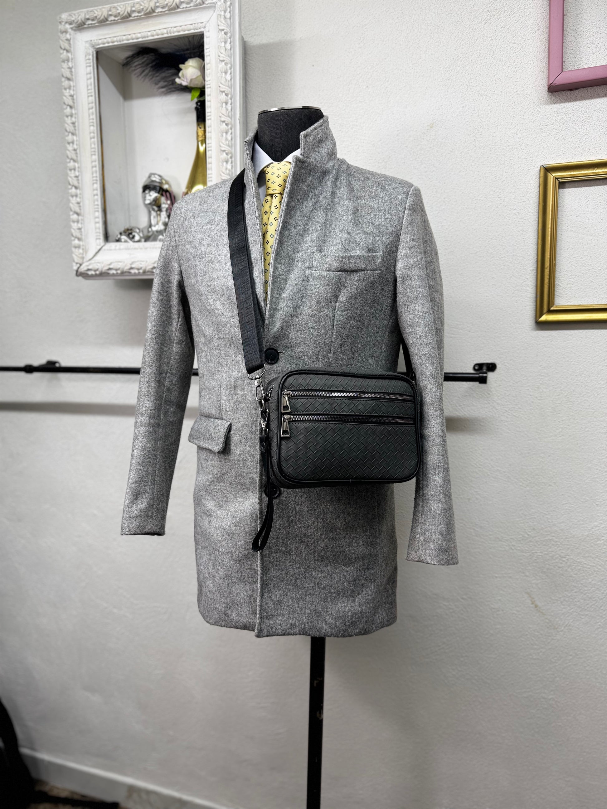 Realizzata in ecopelle lavorata con trama intrecciata, presenta una struttura solida ma leggera, ideale per l’uso urbano e professionale. Il design pulito è arricchito da doppia tasca frontale con chiusura a zip, che consente di organizzare in modo ordinato smartphone, portafoglio, chiavi e piccoli oggetti essenziali.