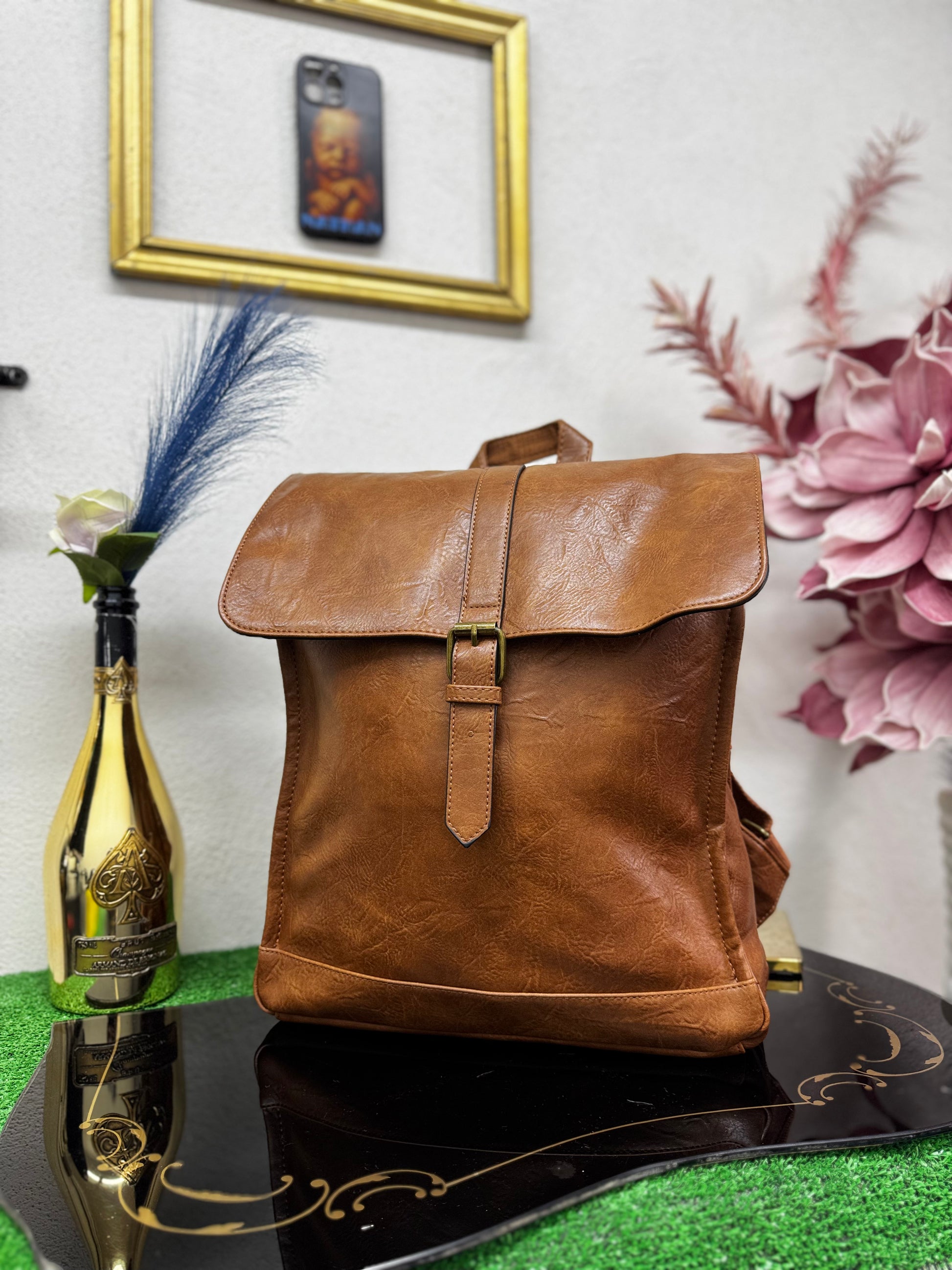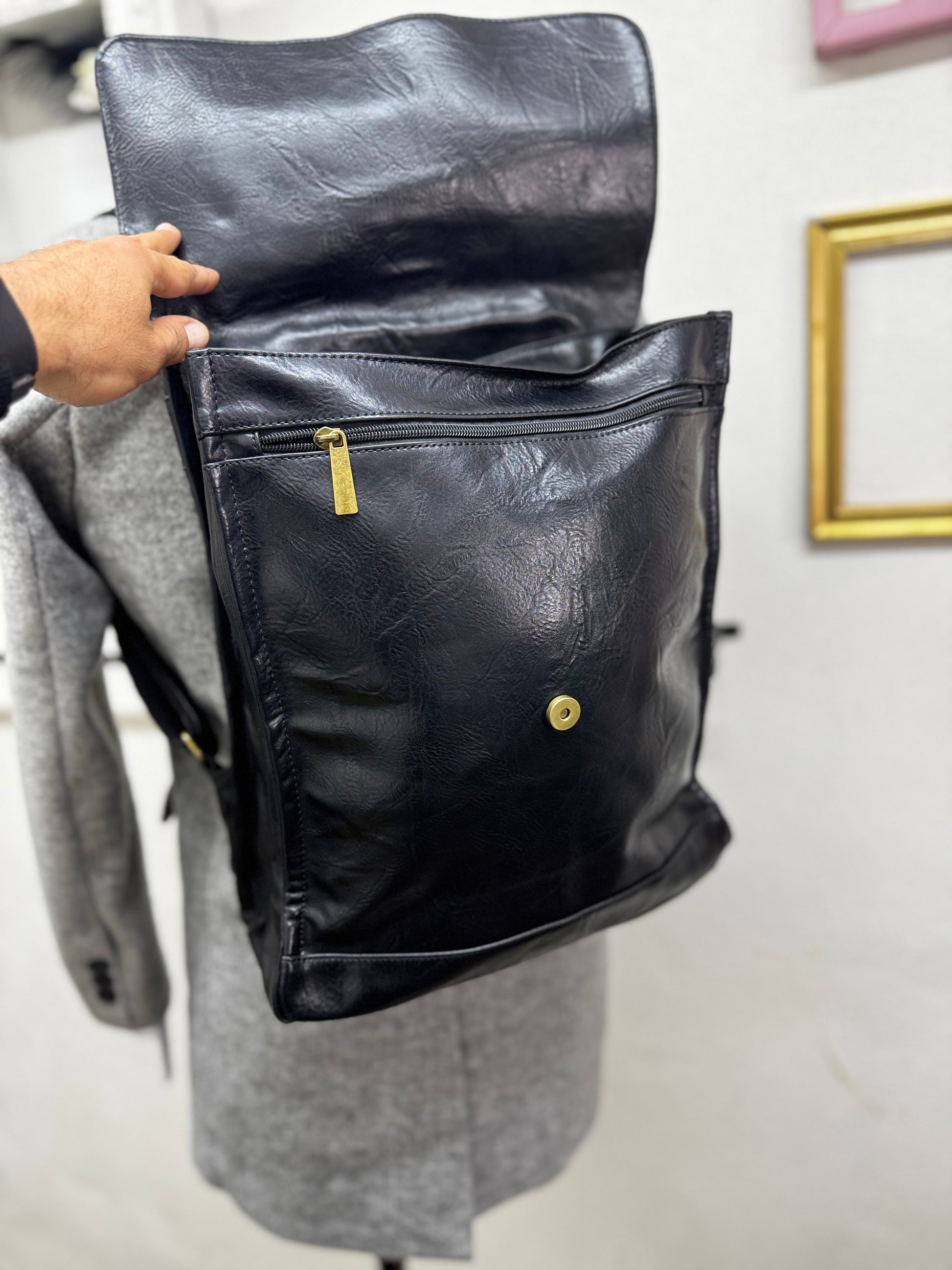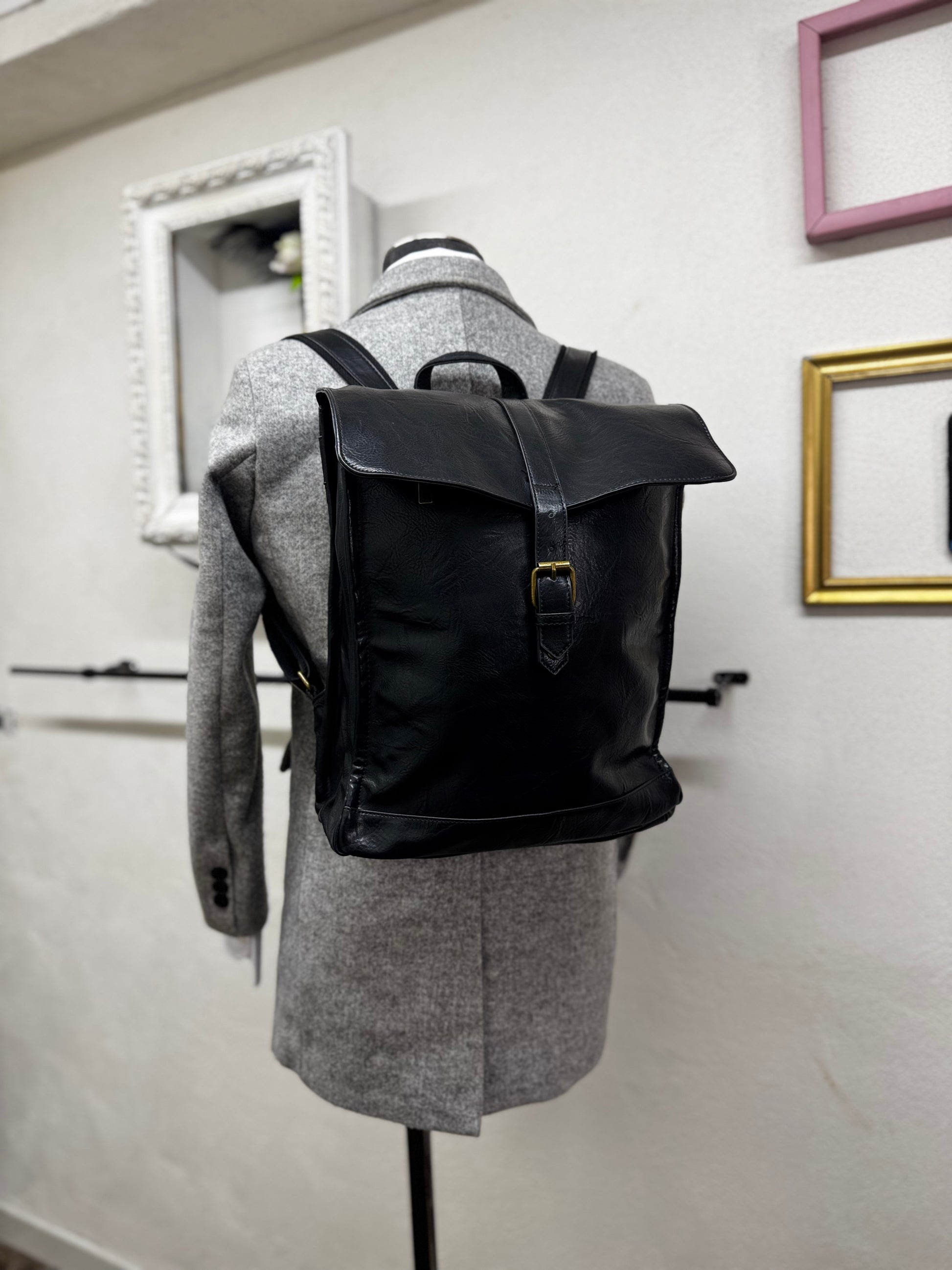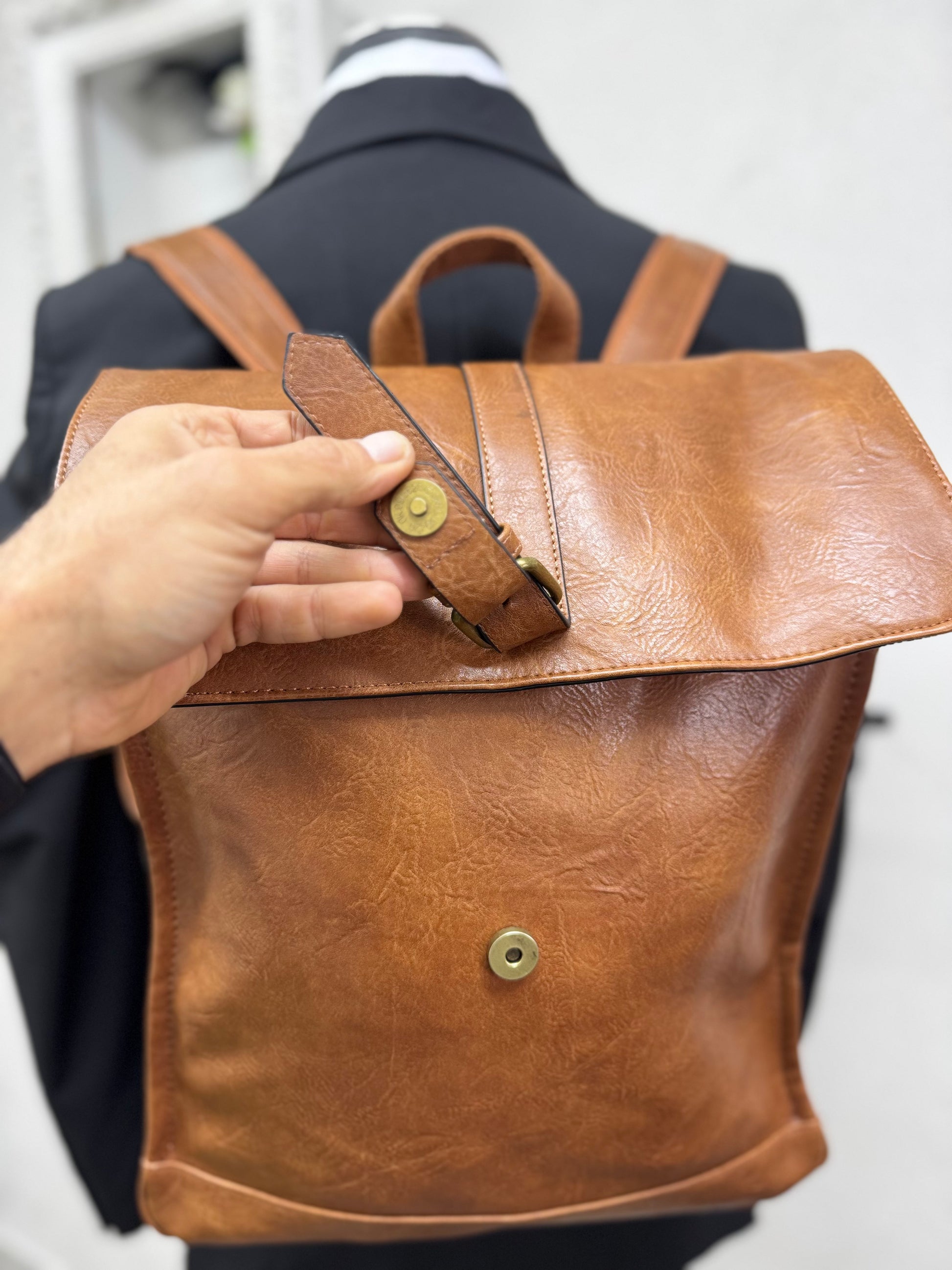 Realizzato in ecopelle morbida ma strutturata, presenta una linea verticale solida e compatta, valorizzata dalla patta superiore con fibbia che caratterizza il design e protegge il contenuto. La chiusura a zip interna aggiunge sicurezza, rendendo lo zaino adatto all’uso quotidiano, al lavoro e agli spostamenti urbani.